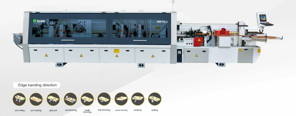 - Merges numerous functions in one machine, including pre-milling, pre-heating, glue pot, snipping, end trimming, rough trimming, fine trimming, corner trimming, scraping and buffing, edge banding work can be done in one process.