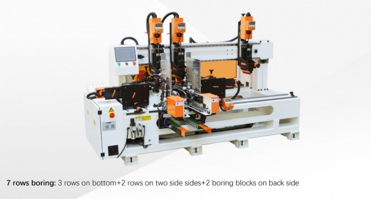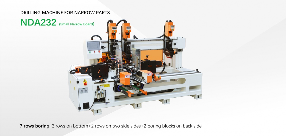 - NDA232, multi rows boring machine is special designed for boring work of small narrow board like drawer small furniture parts, feed in& out from front, this kind of return feed system plus simplified boring process make it possible to finish 4 sides boring including top, two side sides, and back side in one process. Boring block could be customized as per your boring requirement.