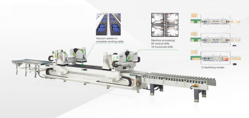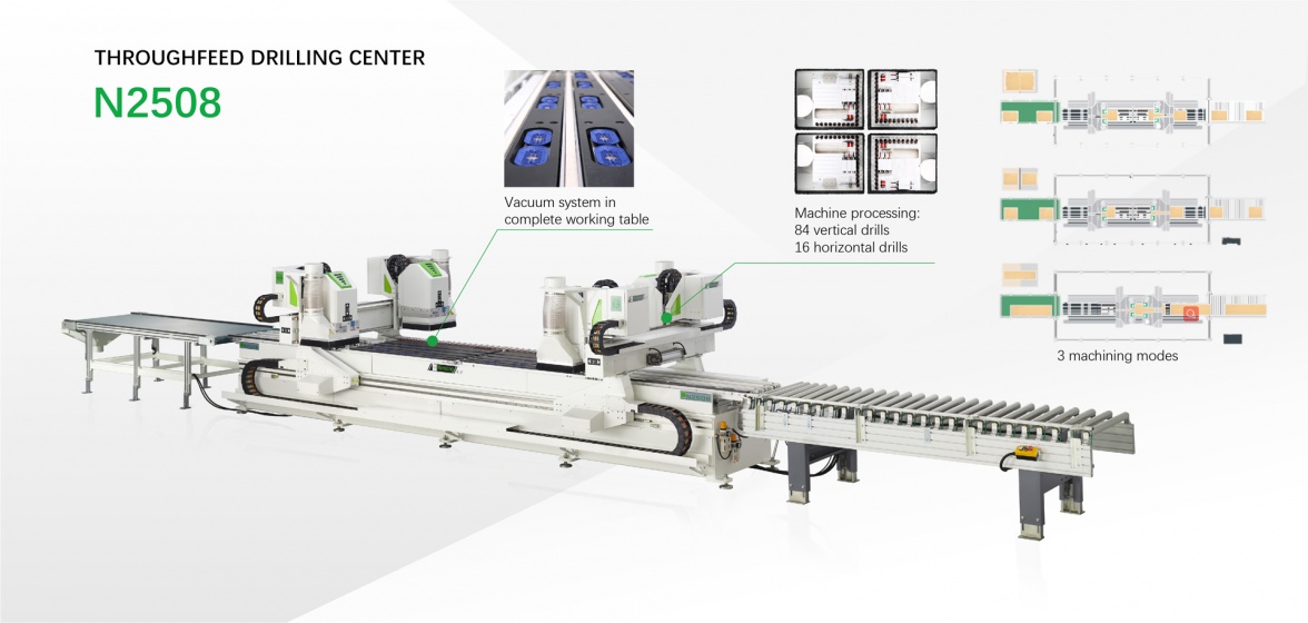 - Auto Boring Line (ABL) N2508 is a continuous boring CNC convenient for various batch sizes, with high efficiency, accuracy, flexibility, and more advantages in production. It is particularly suitable for boring non standard products for lowing production cost and shortening production cycle that is one of the best choices for customized orders. This ABL and the relevant furniture software can be linked without extra set up work, boring 4 sides in one process. The dual gantries with 4 boring blocks totally 84 vertical bits and 16 horizontal bits, each boring block and its bits can be operated independently according to the most fit boring arrangements on different sizes of panels.