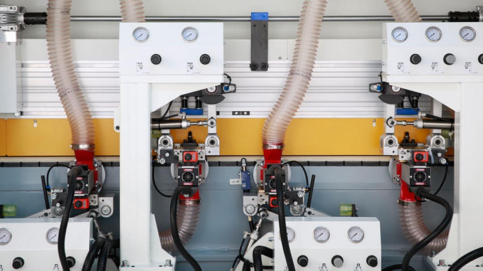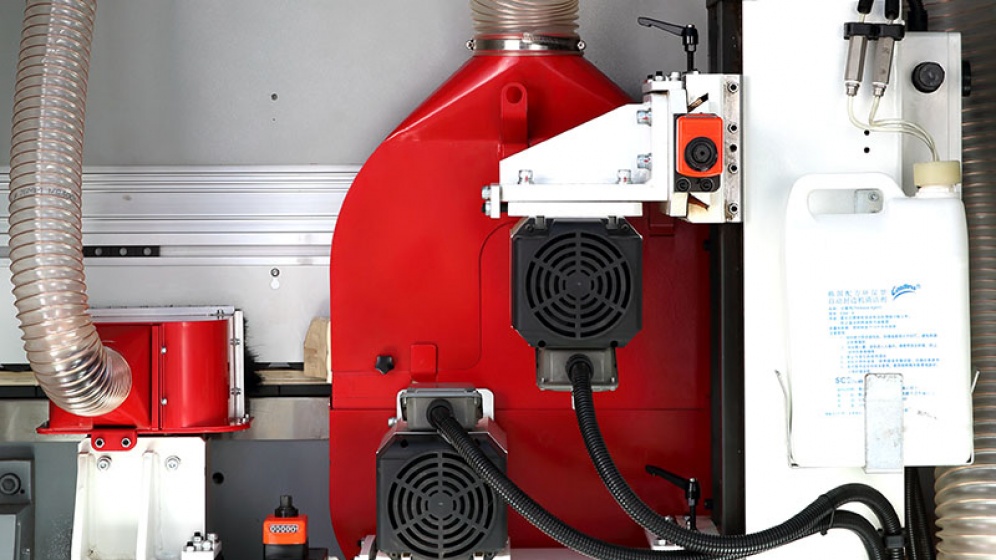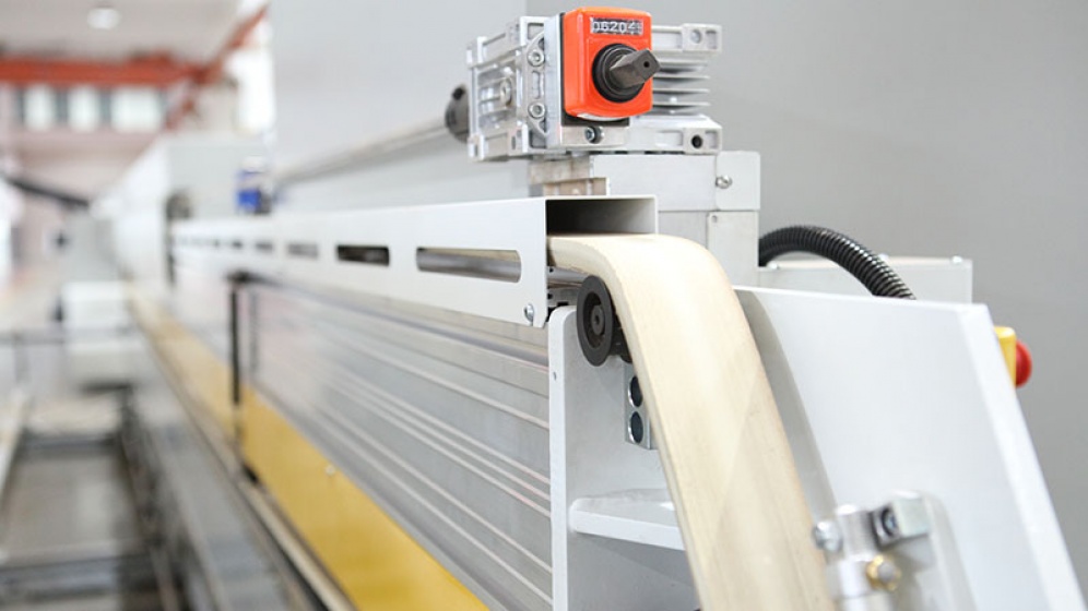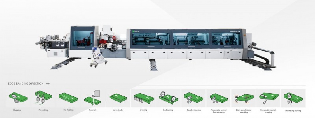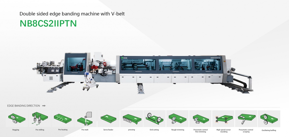 Panels evenly pressed by fiber reinforced V-belt to ensure smooth conveying, clean with no marks, resulting excellent edge banding quality; Auto raised up positioning by “dog head” in conveying chain help to convey narrow long work piece.