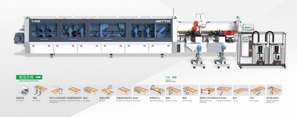 - Full functional units including PC control, pre-milling, pre-heating, pre-melt, 2 quick melt, 8 tapes changing system, dual rails for end trimming, auto tool adjustment by 2 fine trimming, 4 motors with tools for corner trimming, auto tool adjustment by 2 radius scraping, pneumatic flat scraping, 2 sets of oscillating buffing; Panels are evenly pressed by V-belt to maximize stability;