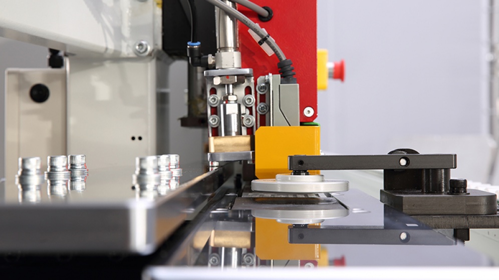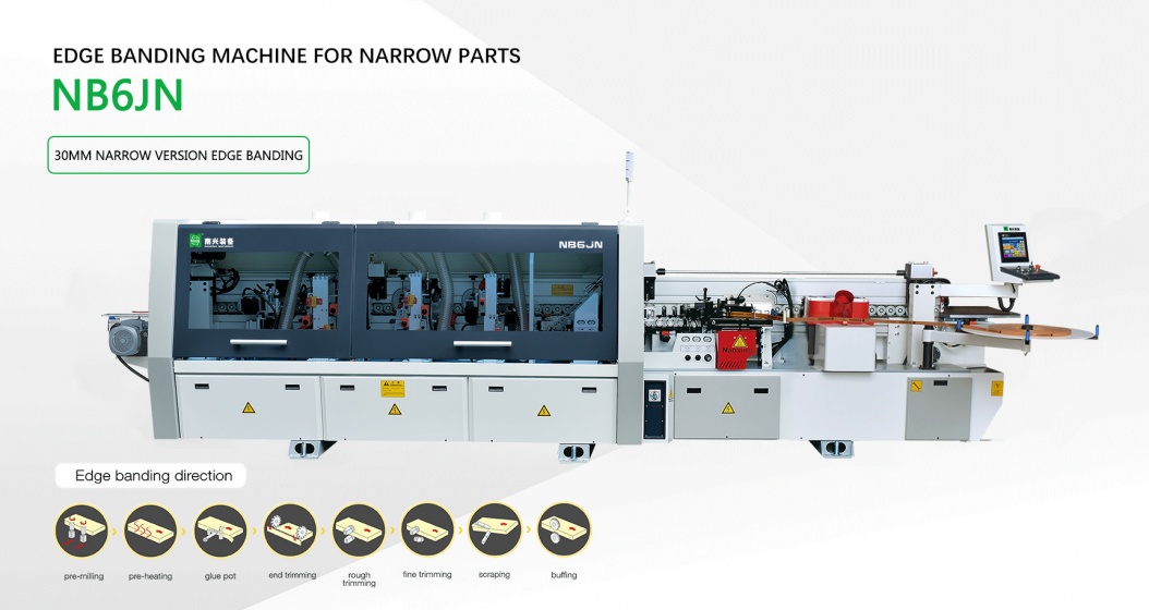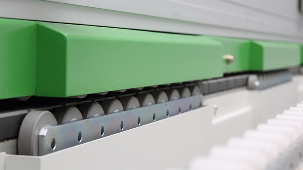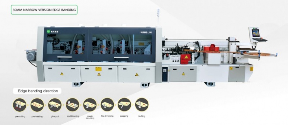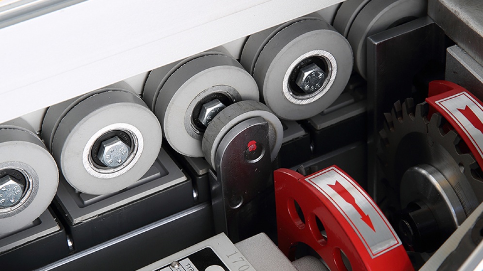 Compact press rollers cooperate with additional assistance rollers on front and in between make it possible to do edge banding work for min 30mm work piece in width.