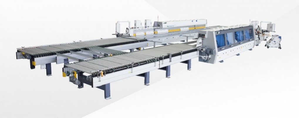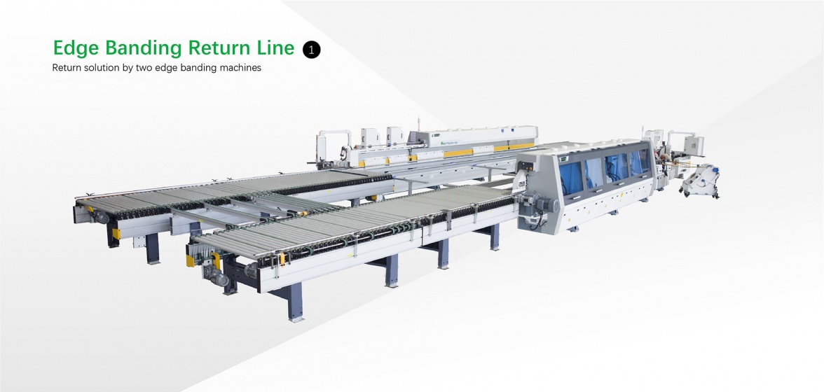 - Two sets of auto edge banding machines cooperate well to finish 2 side sides edge banding in one process with connection of return conveyor table in between, feed in and feed out in same direction, work pieces could be transported to feed-in area in shortest time.
