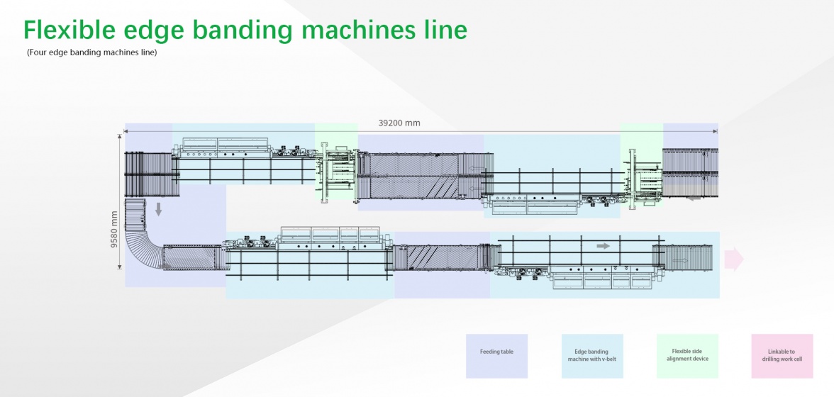 4 machines Single sided edge banding line (Applicable to processing short edge before the long edge, linkable to drilling work cell and drilling work cell at front and end)