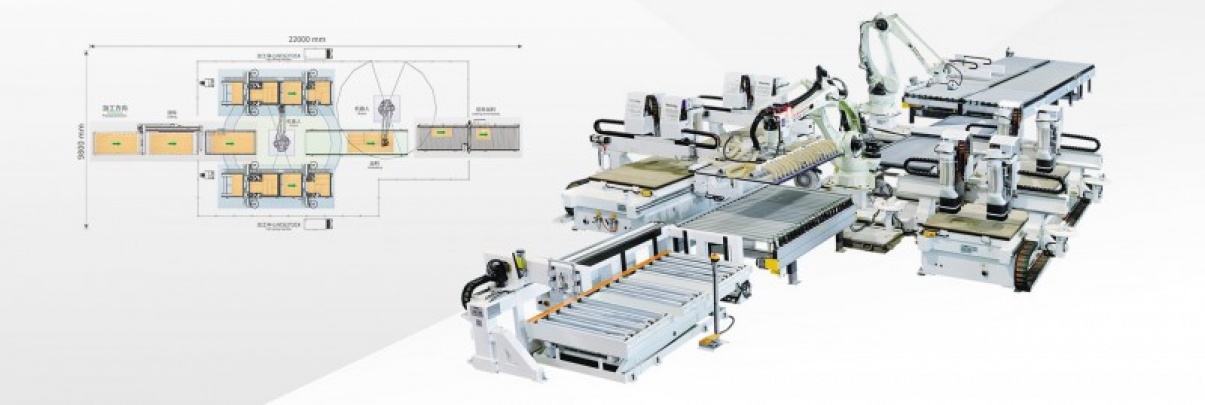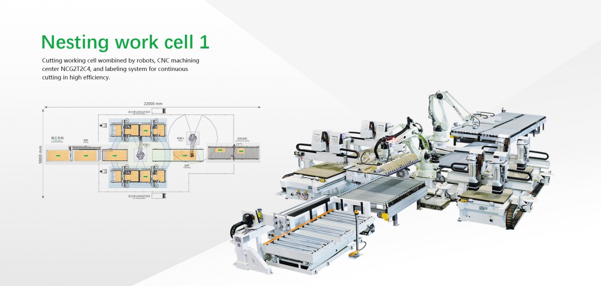 - The cutting cell with 2 sets of NCG2T2C4 CNC machining center for cutting, 2 gantries,2+2 main spindles creating 2 working stations for multiple efficiency in panel processing, single machine can finish one sheet of standard 4’×8’ or 4’×9’ panel within 1.5 min. Utilization rate is 3% higher than computer panel saw. Tireless robots link with 2 sets of NCG2T2C4 perfectly to achieve complete intelligent automatic cutting process.